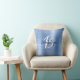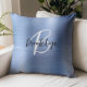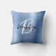 This elegant personalized throw pillow features a monogram and first name in modern black and white script on a glam blue faux brushed metal background.
