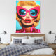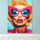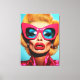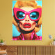 A striking, high-fashion portrait of a glamorous diva with voluminous blonde hair, oversized hot pink cat-eye sunglasses, bold red lips, and electric blue eyeshadow. The look is fierce, retro, and unapologetically fabulous — a pop-art dream in vivid color.
