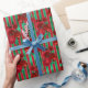 Add a glam touch to your holiday gifts with this red and green faux foil striped Christmas wrapping paper decorated with a pattern of red floral bouquets.