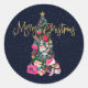 This girly and glamorous Christmas sticker will be the talk of all your friends and family. It's a unique and stylish concept for your holiday papery. It depicts faux gold glitter typography saying, "Merry Christmas." It also features hand-drawn and hand-painted watercolor purses, high heel shoes, faux glitter ornaments, makeup, perfume bottles, wallets, candy canes, gift bag, and gift box. These elements are hung on a green snowy Christmas tree with a gold star topper. The background is a dark navy blue watercolor night sky with flurry snow falling on the ground. The color palette includes bright pinks, blush pinks, coral pinks, black, gold, silver, red, peach, forest green, and white. It's a beautiful, chic, and trendy design for the modern fashionista which is infused with holiday spirit!