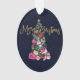 This girly and glamorous Christmas ornament will be the talk of all your friends and family. It's a unique and stylish concept for your holiday papery. It depicts faux gold glitter typography saying, "Merry Christmas." It also features hand-drawn and hand-painted watercolor purses, high heel shoes, faux glitter ornaments, makeup, perfume bottles, wallets, candy canes, gift bag, and gift box. These elements are hung on a green snowy Christmas tree with a gold star topper. The background is a dark navy blue watercolor night sky with flurry snow falling on the ground. On the back is a cute pattern comprised of all the elements together. The color palette includes bright pinks, blush pinks, coral pinks, black, gold, silver, red, peach, forest green, and white. It's a beautiful, chic, and trendy design for the modern fashionista which is infused with holiday spirit!