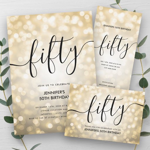 Gold Glitter Lights 50th Birthday Stationery SetDesigned by Marta Burton