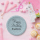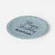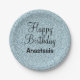 Personalized girly and glam Happy Birthday paper plate with a light blue silver glitter sparkles background and elegant black writing. You can easily add the name of your choice and change the color and font of the name using the customize option!