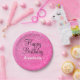 Personalized girly and glam Happy Birthday paper plate with a hot pink glitter sparkle background and elegant black and white writing. You can easily add the name of your choice and change the color and font of the name using the customize option!
