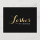 Coordinates with the Glam Lashes Script Text Gold/Black Business Card Template by 1201AM. A glamorous, cursive font spells "Lashes" in faux gold on this customizable postcard template. Add your name or business name for a personalized logo. Designed for eyelash extension experts, lash technicians, makeup artists and more. © 1201AM CREATIVE