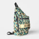 Blue and black leopard dots on a shimmery gold backdrop with a gold pearl necklace gold banner on the front pocket where you can personalize it with a name, phrase or logo or you can keep it as is with the words "Boss Lady". Chic glam leopard theme.