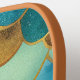 This unique pickleball paddle features a background of faux gold, shades of aqua and teal, in a mermaid fish scale pattern. Add a trio of initials to personalize it. Makes a great gift for bridesmaid, mom, daughter, sister, or anyone in the family who loves pickleball. Created by Simply Farmhouse Press.