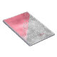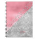 Glam custom spiral notebook, with graphics of a pink foil look over half the cover and a glittery silver done on the other half. Graphics of silver glitter runs down the middle of the notebook. Personalize the text for use at home, school or office.