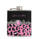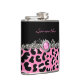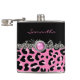 Chic lady's flask done in black, on top, and a pink and black spotted jaguar pattern, on the bottom. Graphics of an ornate diamond looking border, with a pink bauble, runs across the middle of the case bordering the jaguar pattern. Pink colored text is ready to personalize, for yourself or as a elegant gift for her.