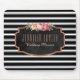 Add chic elegance to your workspace with a modern black and white striped faux rose gold glitter monogrammed mouse pad- Timeless, classy pink floral and rose gold color combo with black and white accents. Center has faux black chalkboard with faux rose gold glitter trim and vintage pink rose bouquet at top. Personalized name and job title or custom text in matching rose gold and pink elegant lettering. Black and white stripes background. Note: All images are printed. Not actual metal, chalkboard, or glitter. Give a personalized gift for her that will not only be used, but enjoyed. Spruce up that boring cubicle with a bit of bling! Sophisticated, customized gift for executive females and coworkers or for stylish girly home office decor.