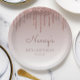 These chic, elegant 80th birthday party paper plates feature a sparkly rose gold faux glitter drip border and rose gold ombre background. Personalize them with the guest of honor's name in dark rose handwriting script, with her birthday and date below in sans serif font.