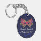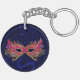 Festive Masquerade Ball Sweet 16 birthday party key chain favor. Graphics of an ornate face mask decorates the dark blue starry background, on both sides. Text in white, on the front, is fully customizable for you to personalize for your event.