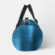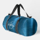 This personalized duffel bag features a monogram and first name in modern turquoise and white script on a glam teal blue faux brushed metal background.