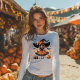 Get ready to turn heads this Halloween with our sassy witch t-shirt, illustrating a confident girl in retro sunglasses, a flouncy polka-dot skirt, and high heels, holding a zesty cocktail amid swirling bats and autumn foliage. The cheerful jack-o'-lantern and mini pumpkin accents add a dash of festive charm, making it a standout choice for spooky season fashion. Crafted for durability and vibrant color, this tee is great for costume parties or everyday wear—treat yourself to this fun, eye-catching design and let your inner witch shine!