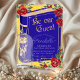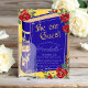 This custom party invitation features a glamorous Beauty and the Beast fairy tale theme. The background yellow with a gold foil style frame. The border is accented with red roses and vines. A blue fairytale book cover is printed across the center with the "Be Our Guest" phrase printed in a gold glitter design. A magic gold rose in a vase is pictured in the bottom left.