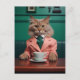 Glamorous bengal cat in a fancy pink suit drinking coffee in a bar
