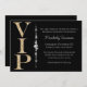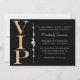 This custom party invitation features a glamorous and elegant theme on a black background. The VIP title is printed in a gold glitter design on the left. A band of diamonds separates the text area. It's perfect for a birthday party, bridal shower, or other fabulous celebration.