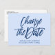 Elegant white Marbled and glitter Wedding Postponement or Date Change announcement featuring a trendy typography lettering saying "Change the date" in trendy glitter shimmering blue over a glamorous pale blue background. For custom request please write at citronelladesign@gmail.com