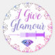 Done in colors of purple and pink with a jewel frame and punctuated with a sparkly diamond. It says "I give glamour" with an image of a purple syringe finishing the quote. Pretty, fun and humorous. Perfect for a nurse or any healthcare worker.