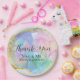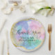 These custom party plates feature an image of a beautiful opal gemstone with a faux gold foil border and accents. The background is a white glitter pattern. The pastel colors appear iridescent. The opal stone are the birthstone for October and are one of the most pretty natural semi precious stones.