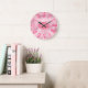 This glamorous and girly wall clock features a shiny looking, pink foil design. An image of bright pink glitter lips is placed in the center. The hours are printed in a Roman numeral design.