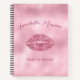 This glamorous and girly custom notebook features a shiny looking, pink foil design. An image of bright pink glitter lips is placed in the center. A sample name is printed above the lips in an elegant script font. A sample makeup artist title is printed below.