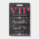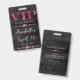This glamorous VIP all access pass badge features a sparkly, feminine design on a black background. The VIP title is printed in a pink foil style font, followed by the event title. Strings of pink diamonds separates the text. The party or event location and time are printed on the back. It's perfect for a birthday party, sweet 16, bridal shower, or other elegant celebration.
