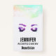 A name tag with a beautiful watercolor painted illustration. Pretty purple eyes and brows, eyes closed showing off long elegant eye lashes.