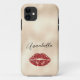This glamorous and girly custom phone case features a champagne gold foil background. An image of bright red glitter lips is placed in the center. A sample name is printed above the lips in an elegant script font. Your can personalize the phone case and to add your own custom name or text.
