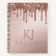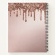 This stylish custom notebook features a glamorous, girly, rose gold colored background with a foil texture design. Glitter sequins are dripping across the top portion. Monogram initials are placed beneath the glitter, followed by a sample name printed in an elegant script font. The back of the notebook features a matching rose gold background with glitter drips.
