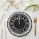 This glamorous custom party plate features a festive New Year's eve theme. A clock with the time at almost midnight is printed in a faux silver foil on a black background. The border features a frame of diamonds pattern.