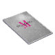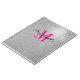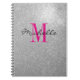 Glamorous silver glitter monogram spiral notebook. Monogrammed office and school supplies with faux silvery texture. Add your own classy name initial letter. Elegant script typography. Chic metallic design for writing down notes, office work, wedding planning and more. Neon pink and black logo with sparkly sparkles and glittery glimmers background.
