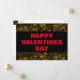 This is a postcard style greeting card. This design has a little glamour and glitz. There's a gold glitter looking background with a black box overlay. In big bold red letters, the message reads "HAPPY VALENTINES DAY". Also there are ruled lines for the mailing address. If you don't want to use this as a postcard, you can remove the ruled lines and use this card with an envelope.