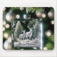 A square Christmas ornament hangs on a tree, depicting two deer in a snowy forest with Merry Christmas text