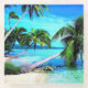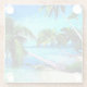 Glass coaster shown with a photo print of a pretty tropical beach with palms.