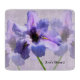 Glass cutting board with blue Irises and a place to add your name. The background is a grunge lavender so it's a very pretty board.