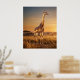 A majestic glass giraffe stands tall across the open savannah, crafted from transparent crystal with subtle amber tinting, polished contours, and graceful internal reflections. Long elegant legs, detailed ossicones, and a calm expression create a refined modern sculpture feel. Golden grasses, acacia trees, distant hills, and warm sunrise light surround the scene with serene African beauty. Perfect for safari-themed interiors, nurseries, contemporary homes, wildlife lovers, and statement walls seeking sophisticated animal art.