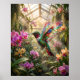 A radiant stained glass hummingbird hovers gracefully in a tropical orchid atrium, its wings glowing with emerald green, ruby red, turquoise blue, amber gold, and violet jewel tones. Fine metallic framework, luminous transparency, and brilliant light refraction create a handcrafted cathedral-style masterpiece full of motion and elegance. Surrounded by exotic blooms, hanging vines, misted leaves, drifting pollen, and warm filtered sunlight, the scene feels vibrant and luxurious. Perfect for colorful interiors, spring décor, bird lovers, nurseries, and gift shoppers seeking joyful premium wall art.
