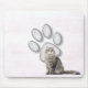 Transparent pawprint heart on soft pink abstract watercolor background with gray kitty for cat.