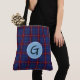 Colorful plaid tote bag done in the traditional blue, green,red, and black clan Glenn tartan pattern. A decorative light blue round text plaque, on the front of the bag, has a black single letter monogram ready to personalize. Great all purpose tote.