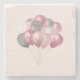 A stone coaster with an illustration of a bunch of balloons in pink and silver gray colors.