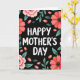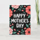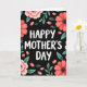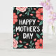 This design shows a deep black background with the large white words “HAPPY MOTHER’S DAY” centered in a simple sans-serif style, standing out clearly. Around the edges, a border of flowers and leaves leans inward as if gently gathering around the message, giving the layout a caring, close-knit feel ❤️. The biggest blossoms are coral-pink with softer rosy tones, and they sit like a loose wreath that frames the text without crowding it. Teal-green leaves and thin sprigs weave between the flowers, adding cooler contrast and a calm, supportive touch. Small glossy oval shapes in brighter pink are tucked among the greenery like berries or sweet treats, adding a light, affectionate sparkle 🌼. Some flower centers include tiny dotted texture, which gives the petals more depth against the dark background. The main text stays in the middle while the floral elements radiate from the perimeter, with coral blooms most prominent near the corners and teal leaves curling between them.