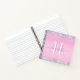 Monogrammed girly notebook featuring sparkly holographic purple and silver faux glitter confetti along the top and bottom against a pink background. Add your monogram initial and your name in a trendy purple script with swashes.
