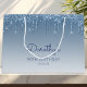 This chic 90th birthday party gift bag features a sparkly blue faux glitter drip border and blue ombre background. Personalize it with her name in handwriting script, along with her birthday and date below.