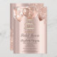 Elegant rose gold glitter drips, champagne glass, and balloons on a rose gold background.