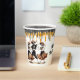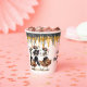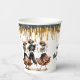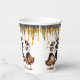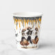 These fun Halloween party paper cups feature a trio of joyful dancing skeletons dressed in their party attire. At the top of the cup are faux glittery black and orange drips. The skeleton image is repeated twice, with black text in between that says "Happy Halloween", and your custom text below. It's easy to change the text! *The glitter is simulated; no actual glitter is used in the product.