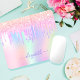 A trendy iridescent background with unicorn and rainbow pastel colors in pink, purple, rose gold, mint green. Decorated with faux glitter drips in rose gold, pink and purple. Personalize and add a name, written with a modern hand lettered style script with swashes. Purple colored letters. To keep the swashes only delete the sample name, leave the spaces or emoji's in front and after the name.