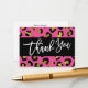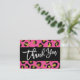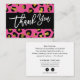 This design feature a white hand lettered "thank you" over a glam fuchsia glitter leopard print a message with custom text for business name and contact on elegant black background. Includes two social media icons and a field for your username.