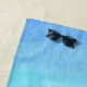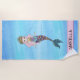 This personalized beach towel has a mermaid with a faux glittered tail wearing a crown, She's set on a shades of blue ocean like background. Personalize with a name on the bottom.