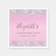 Pretty, glamorous and girly 17th birthday party napkins with sparkly holographic purple, pink and silver faux glitter confetti along the top and bottom against a pink background and her name in a soft grey trendy script.
